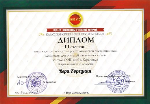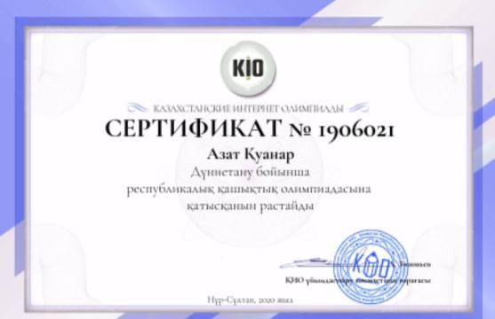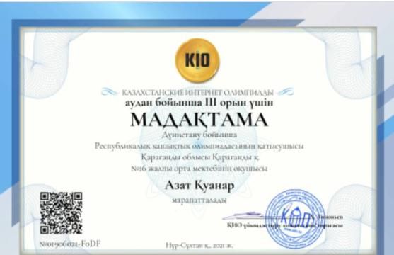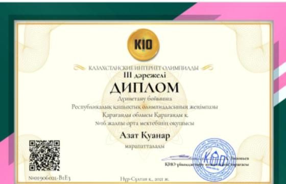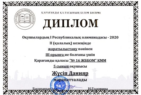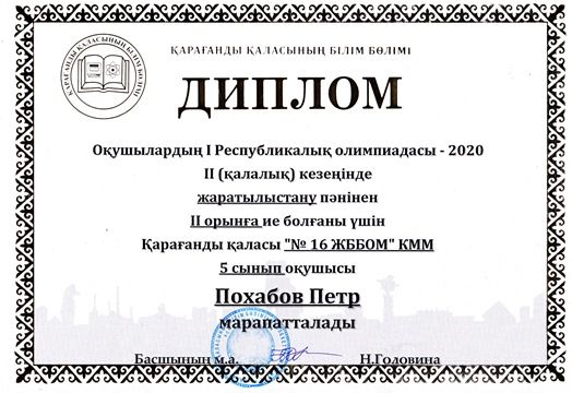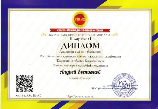 7В сынып оқушысы Костюков Андрей Республикалық қашықтық олимпиадасына қатысып, ІІ дәрежелі дипломмен марапатталды.