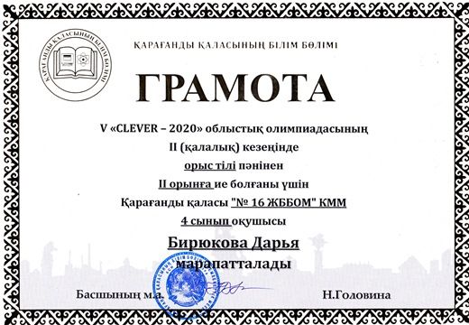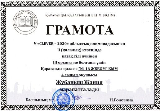 V "CLEVER-2020" облыстық олимпиадасының ІІ (қалалық) кезеңінде 4 сынып оқушылары жүлделі орындарға ие болды.