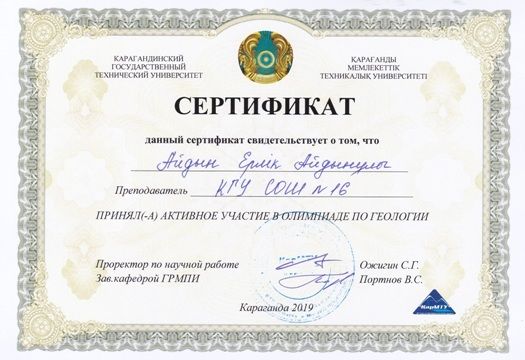 Сертификаты за участие в олимпиаде по "геологии". Учитель Айдын Е.А.