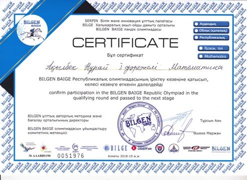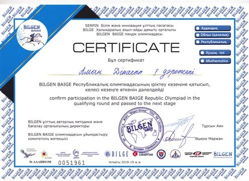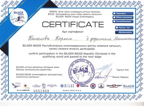 Бастауыш сынып оқушылары "Bilgen baige" Республикалық олимпиадасының іріктеу кезеңіне қатысқы үшін сертификаттармен марапатталды. 2А сынып.