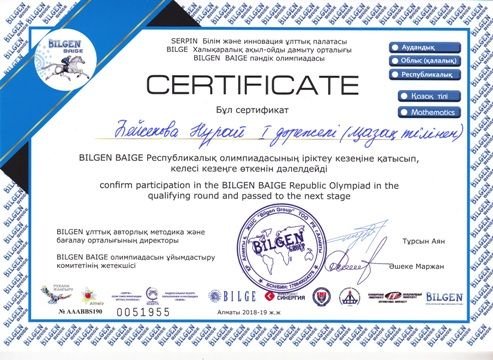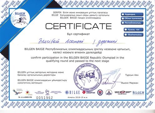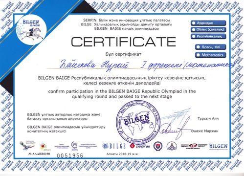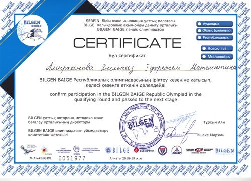 Бастауыш сынып оқушылары "Bilgen baige" Республикалық олимпиадасының іріктеу кезеңіне қатысқы үшін сертификаттармен марапатталды. 2Ә сынып.