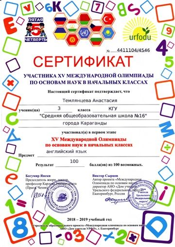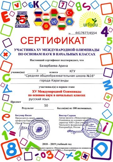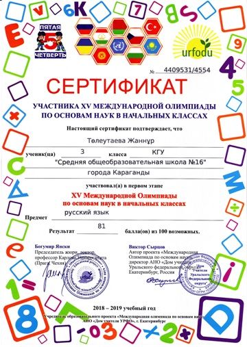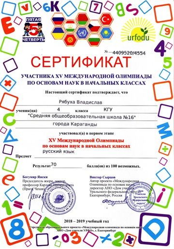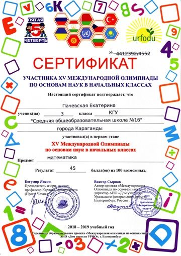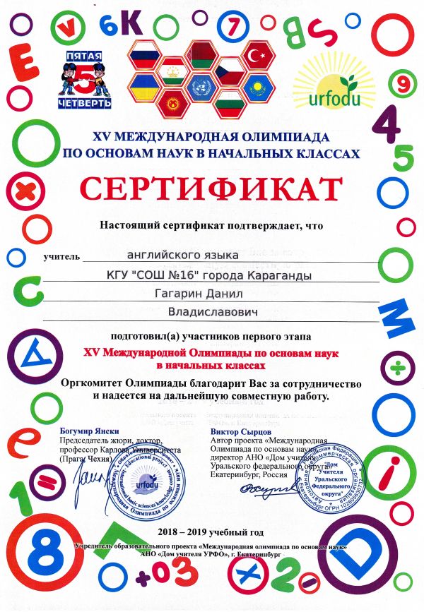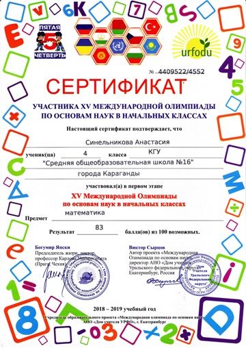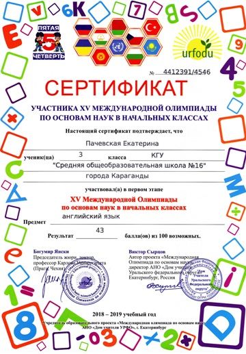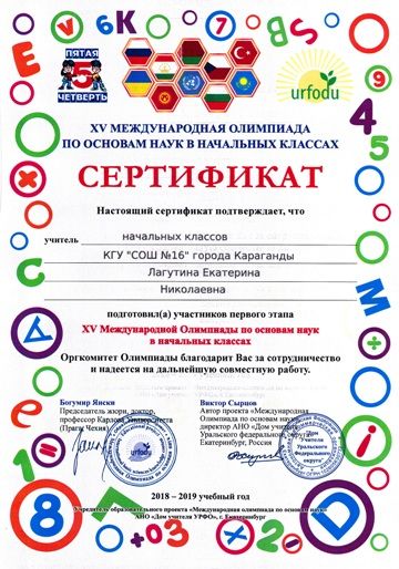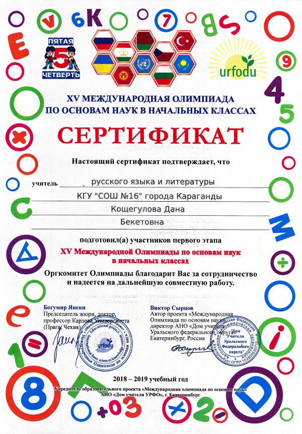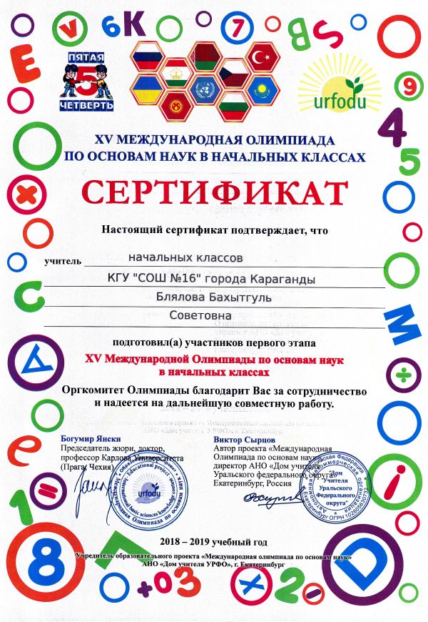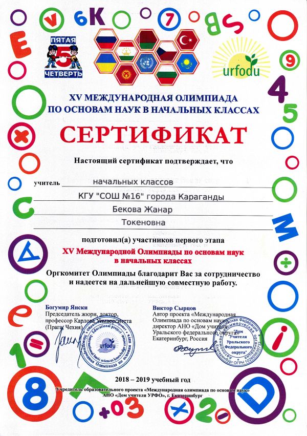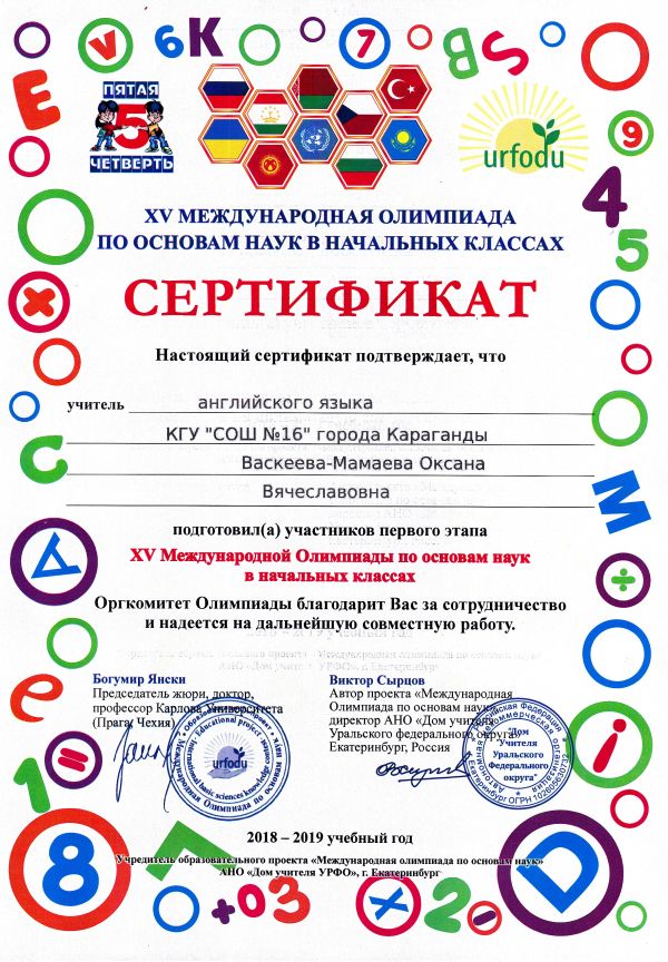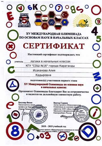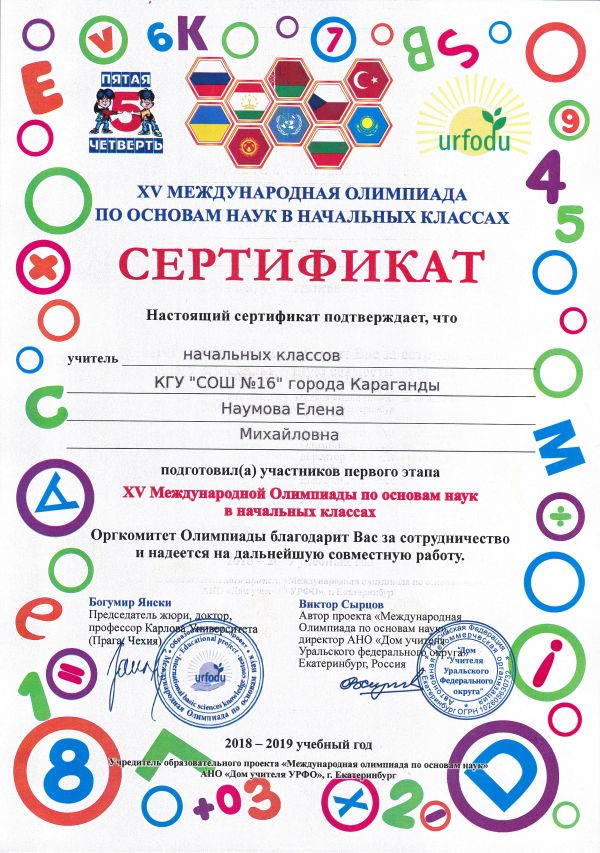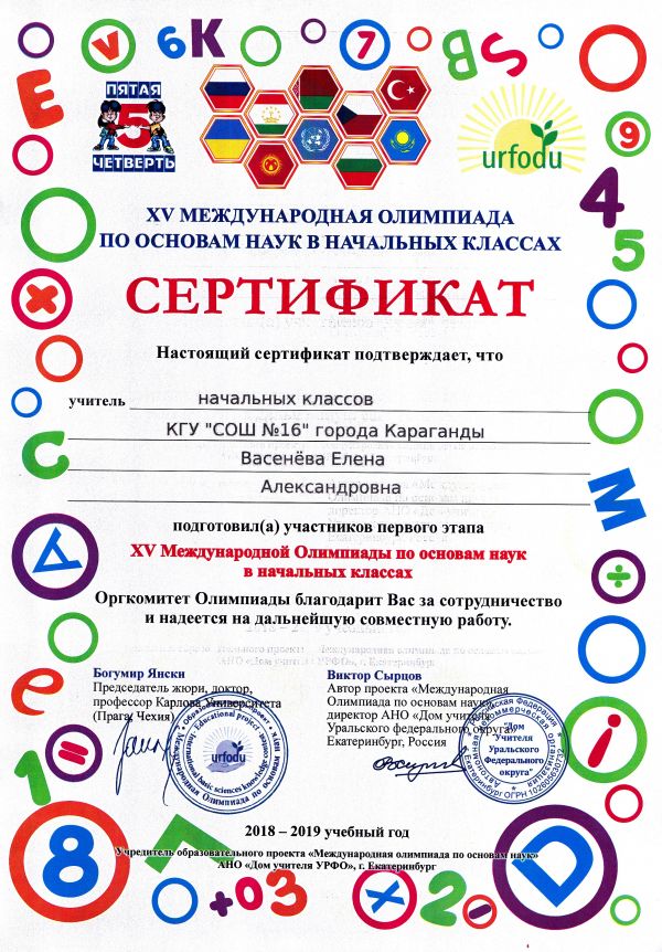 ХV международной олимпиады по основам наук сертификатами награждены учителя начальных классов.