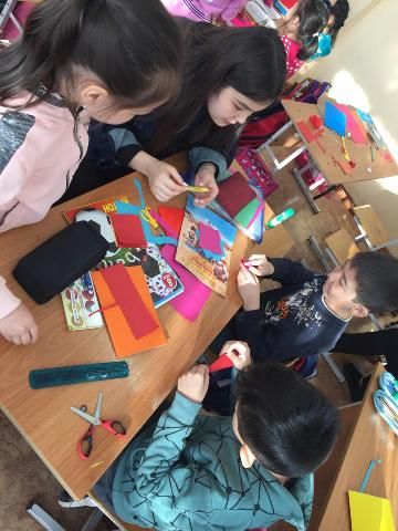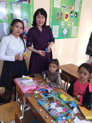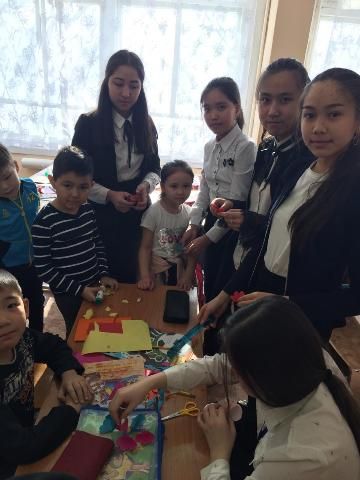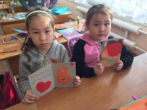8А мен 1А сынып оқушылары бір шаңырақ астында аналарға ашық хаттар мен гүлдер дайындады.