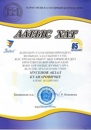 Мектебіміздің технология пәні мұғалімі А.Қ.Мусенов Қарағанды қаласының білім бөлімінің Алғыс хаты берілді.