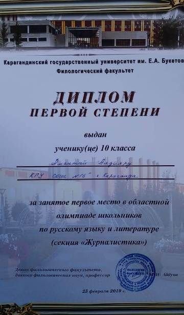 10В сынып оқушысы Амантай Алдияр орыс тілі мен әдебиеті пәнінен өткен облыстық олимпиадаға қатысып, жүлделі І орынға ие болды.