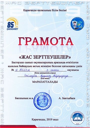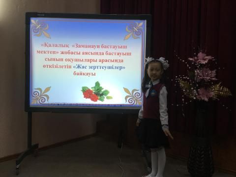 3Ә сынып оқушысы Сайлаубек Қаракөз "Жас зерттеушілер" бастауыш сынып оқушыларының арасында өткізілген қалалық байқауда "Қоқысты да кәдеге жаратуға болады" тақырыбында қорға…