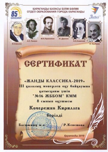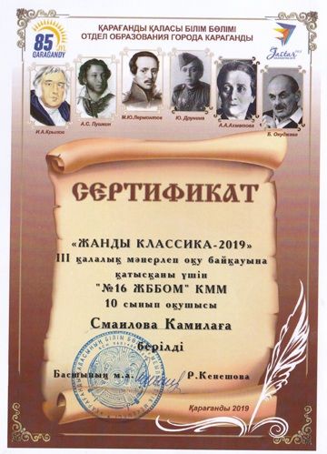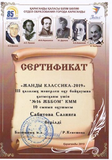 Мектеп оқушылары "Жанды классика-2019" ІІІ қалалық мәнерлеп оқу байқауына қатысып, сертификаттарға ие болды.