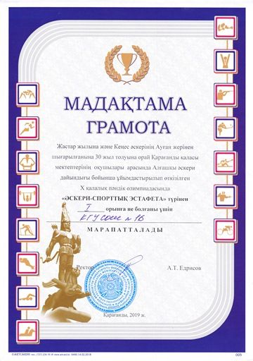 Қарағанды қаласы мектептерінің оқушылары арасында Алғашқы әскери дайындығы бойынша ұйымдастырылған Х қалалық пәндік олимпиадасында "Әскери-спорттық Эстафета" түрінен мектебіміз командалық…