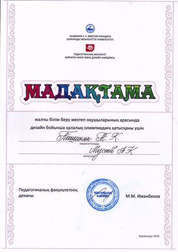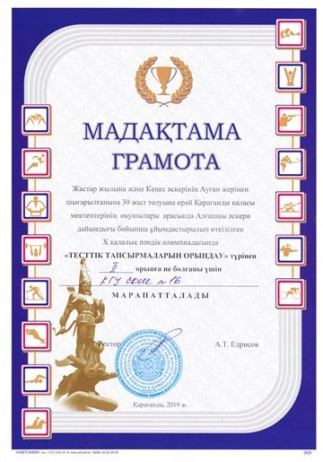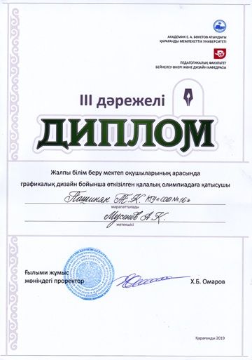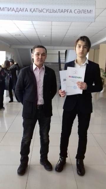 10Б сынып оқушысы Пашинян Тигран оқушылар арасында графикалық дизайн бойынша қалалық олимпиадаға қытысып, ІІІ дәрежелі дипломмен марапатталды. Жетекшісі технология пәні мұғалімі Мусенов А.К.