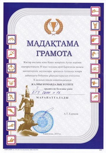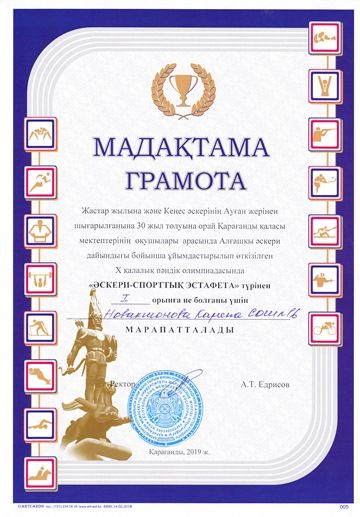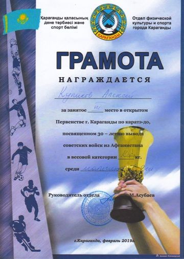 Грамотой награждён ученик 3Г класса Куликов А за занятое ІІІ место в открытом Первенстве г.Караганды по каратэ-до, посвященном 30-летию вывода советских войск из Афганистана.