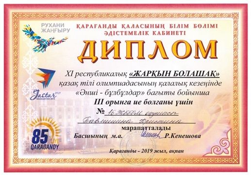 7Б сынып оқушысы Павлишина Кристина XI республикалық "Жарқын болашақ" қазақ тілі олимпиадасының қалалық кезеңінде "Әнші-бұлбұлдар" бағыты бойынша ІІІ орынға ие болды.  Жетек…