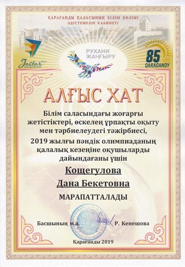 Қарағанды қаласының білім бөлімінің Алғыс хатымен мектебіміздің орыс тілі мен әдебиеті пәні мұғалімі Кощегулова Дана Бекетовна марапатталды.