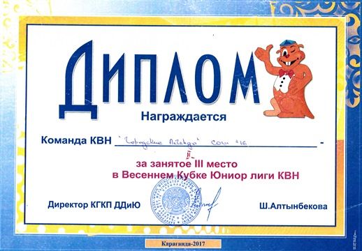 Команда КВН "Городские легенды" СОШ №16 награждается дипломом за занятое ІІІ место в Весеннем Кубке Юниор лиги КВН.