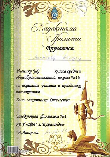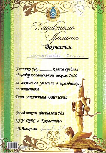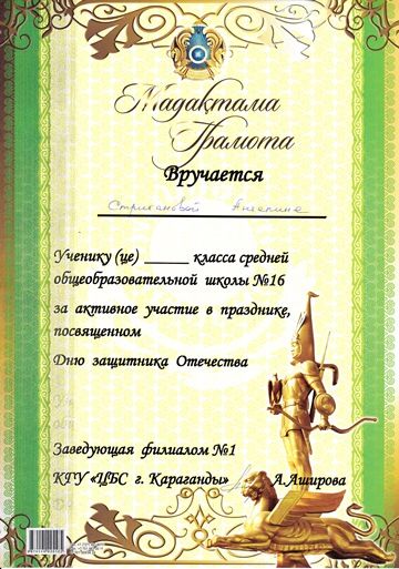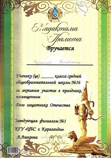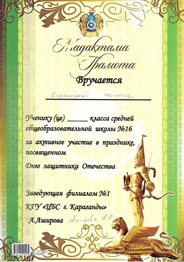 Грамота вручается ученикам СОШ №16 за активные участие в празднике Дню защитника Отечества.