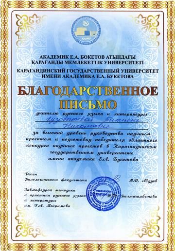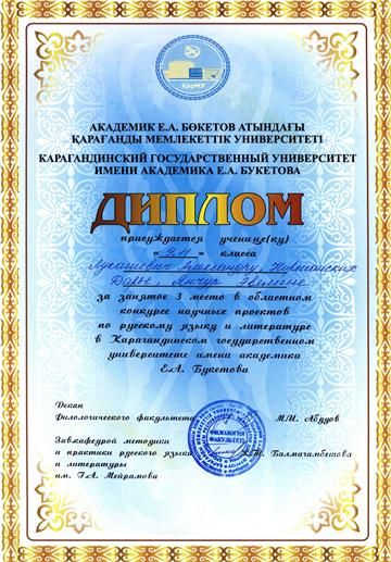 Диплом за занятое ІІІ место в областном конкурсе научных проектов по русскому языку и литературе.