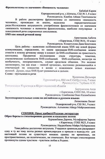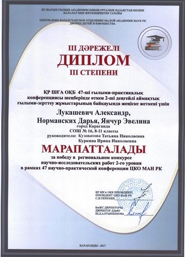 ҚР ШҒА ОҚБ 47-ші ғылыми-практикалық конференциясы шеңберінде өткен 2-ші деңгейлі аймақтық байқауында жеңіске жеткен 8 сынып оқушылары Норманских Дарья, Янчур Эвелина, 11 сынып оқушысы Лукашеви…