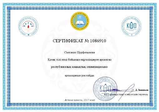 Мектебіміздің қазақ тілі пәні мұғалімдері қазақ тілі пәні бойынша өткен республикалық қашықтық олимпиадасына қатысып сертификатпен марапатталды.
