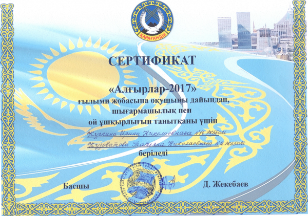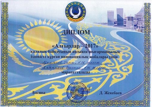 Обучающиеся 6Б класса Г.Мехтиев, Д.Летников награждены дипломами на городском конкурсе "Алғырлар-2017" за  инновационный творческий проект. Руководители проекта И.Н.Куркина, Т.Н.Кузов…