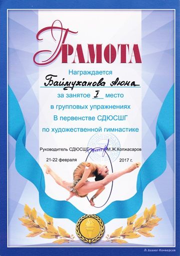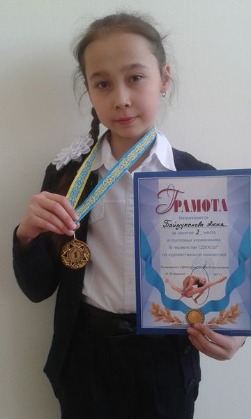 Грамотой награждается учащихся 5В класса Баймуханова Аюна за занятое І место в групповых упражнениях в первенстве СДЮСШГ по художественной гимнастике.