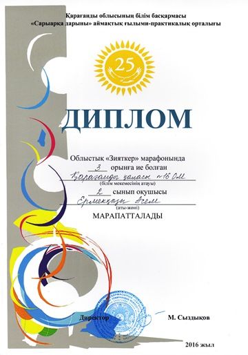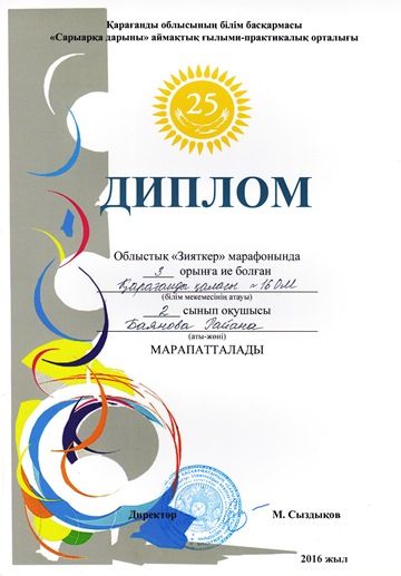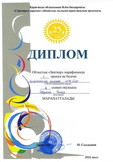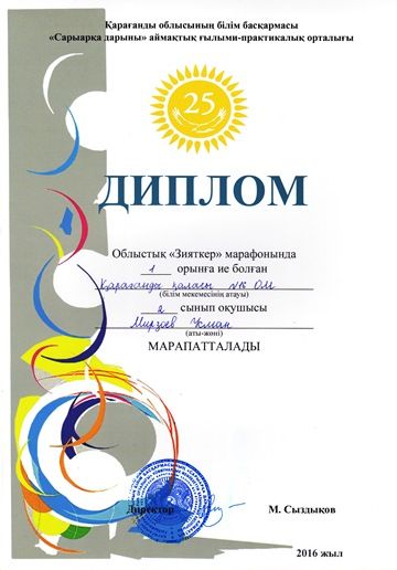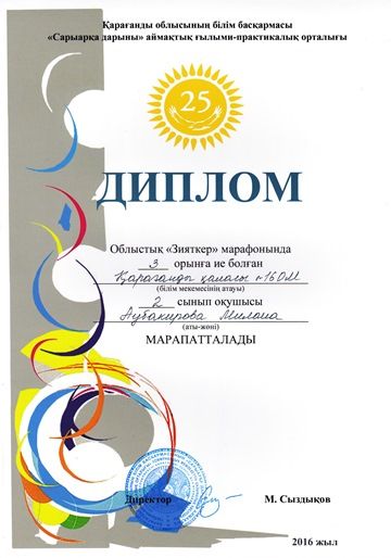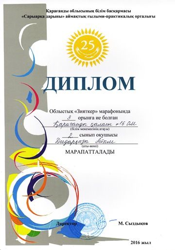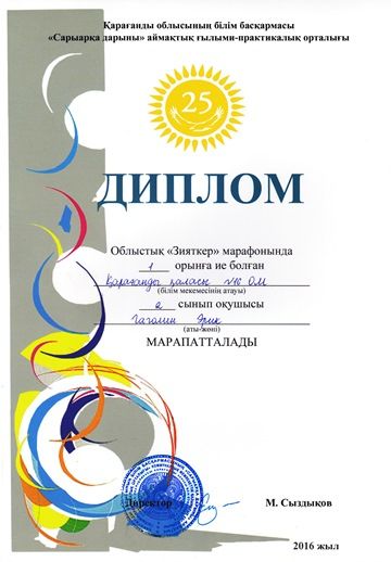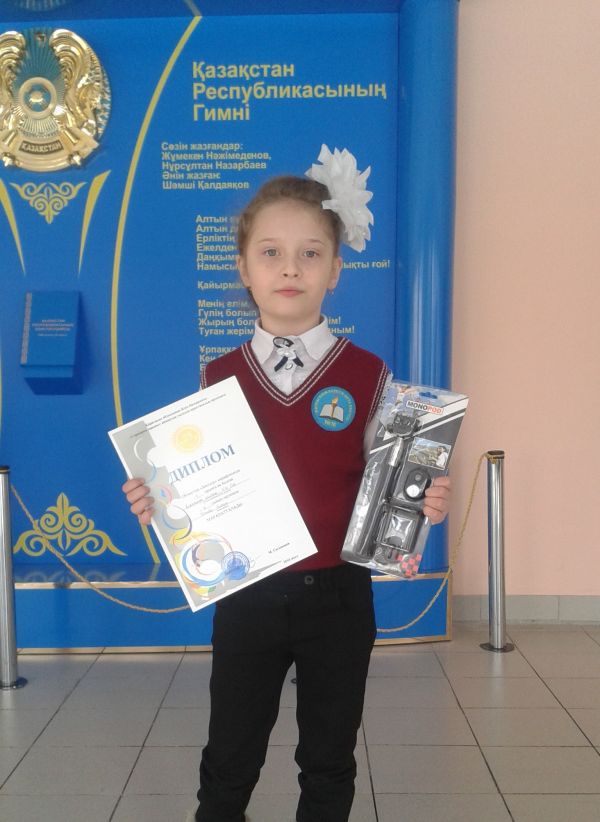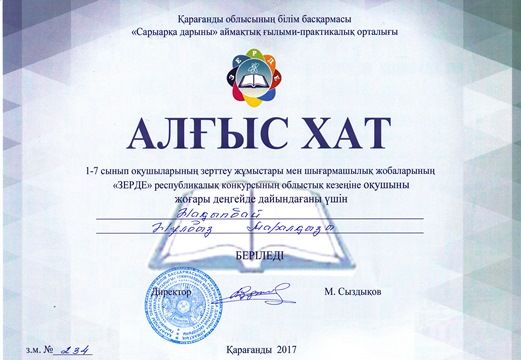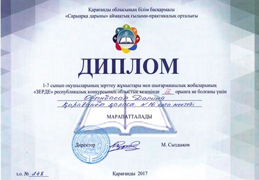 1-7 сынып оқушыларының зерттеу жұмыстары мен шығармашылық жобаларының "Зерде" республикалық конкурсының облыстық кезеңінде ІІІ орынға ие болған 3Г сынып оқушысы Орынбасар Дарина дипломмен…