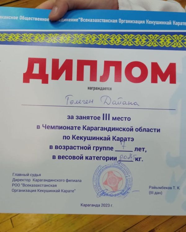 Ученица 1"Б"класса Төлеген Дайана заняла 3 место в Чемпионате Карагандинской области по Кекушинкай Каратэ.