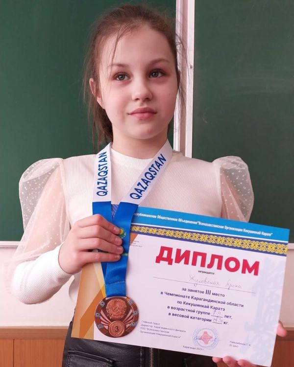 Поздравляем Жуковскую Арину, ученицу 3В класса КГУ ОШ № 16, занявшую 3 место на чемпионате Карагандинской области по Кекушинкай каратэ. Классный руководитель: Блялова Б. С.