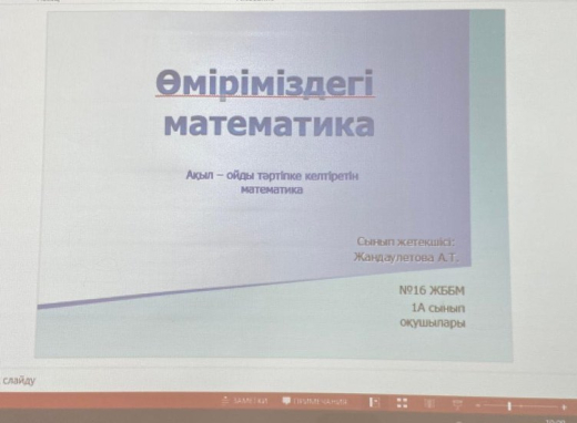 Классный час, посвященный дню «недели математической грамотности», проводимый учебно-методическим центром развития образования Карагандинской области, прошел в 1А классе КГУ ОШ №16 на тему «математика в нашей жизни». Классный руководитель: Жандаулетова А.