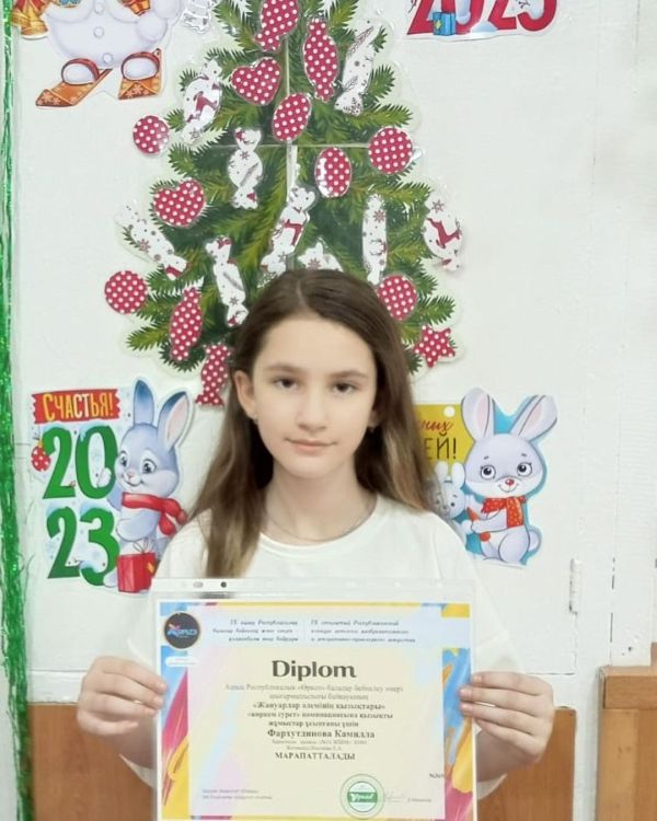 Ученица 7 г класса Искакова Жанерке награждена дипломом 1 степени за участие в городском конкурсе "Литературный сундучок" - читаем всей семьей"