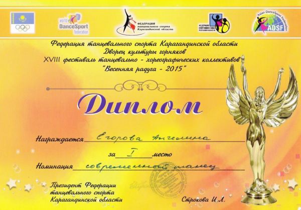 Поздравляем участницу Егорову Ангелину за занятое І место в ХVІІІ фестивале танцевально-хореографических коллективов "Весенняя радуга-2015"
