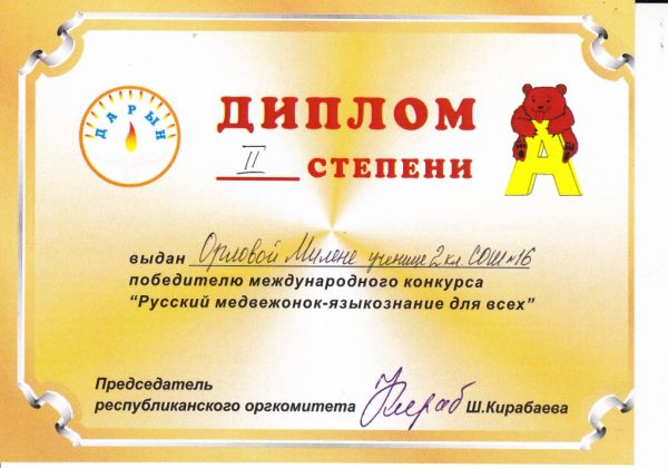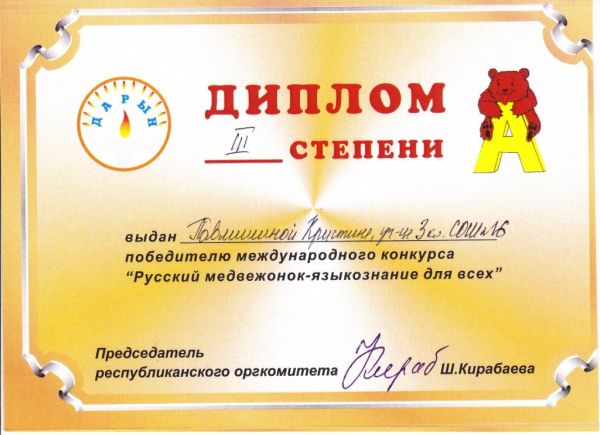 Поздравляем Асылбекова Алена победителя международного конкурса "Русский медвежонок-языкознание для всех".