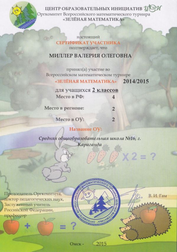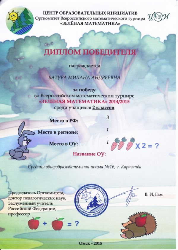 Поздравляем ученицу 2 класса Батура Милану Андреевну за занятое ІІІ место в Всероссийском математическом турнире "Зеленая математика".