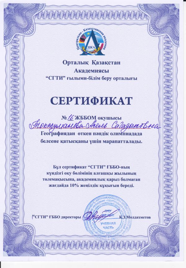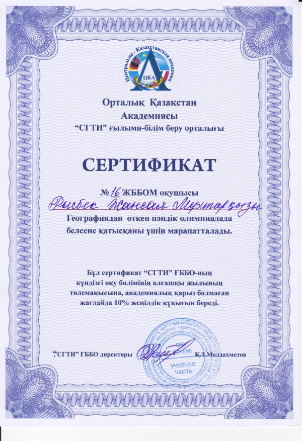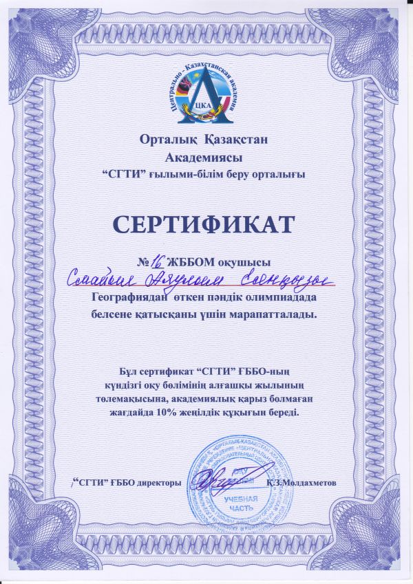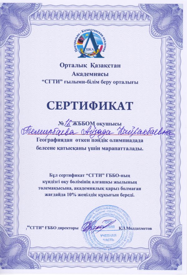 Администрация НОЦ "СГТИ" выражает благодарность учителю географии Смагуловой Асемгуль Бирликовне за активное участие в проведении предметной олимпиады по географии. Ученики 11А и 10А класс…