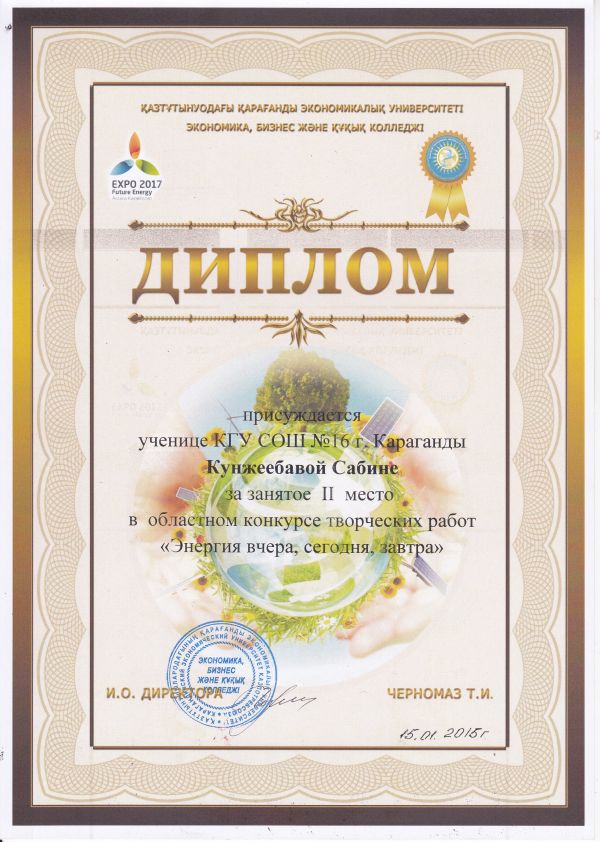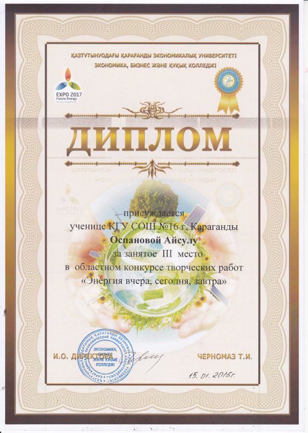 Поздравляем участников областного конкурса творческих работ "Энергия вчера, сегодня, завтра" за занятое II место Кунжеебаева Сабина, III место Оспанова Айсулу, Мурат Амина. Также были нагр…