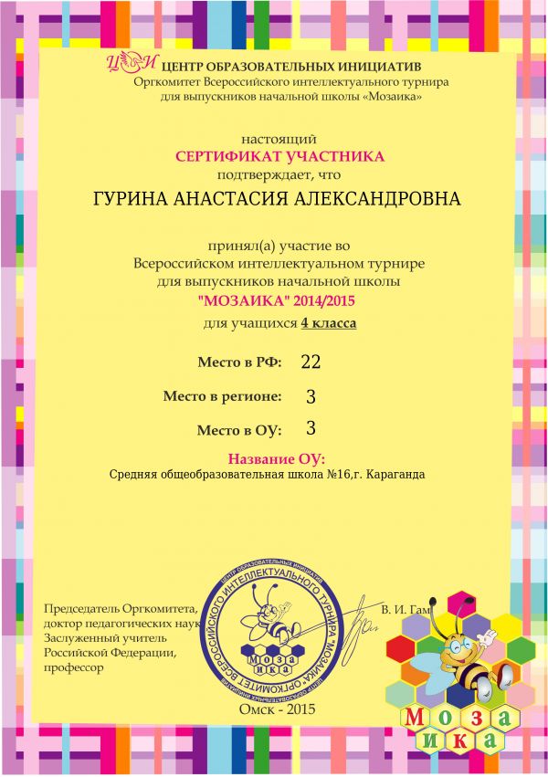 Сертификатом награждается учитель информатики Кенжебекова Балдырган Данибековна, руководитель творческой работы учащегося в областном конкурсе "Энергия -вчера, сегодня, завтра".