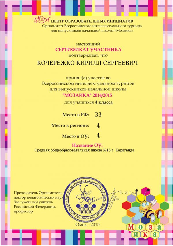 Победители и призеры интеллектуального турнира выпускников начальной школы "Мозайка"