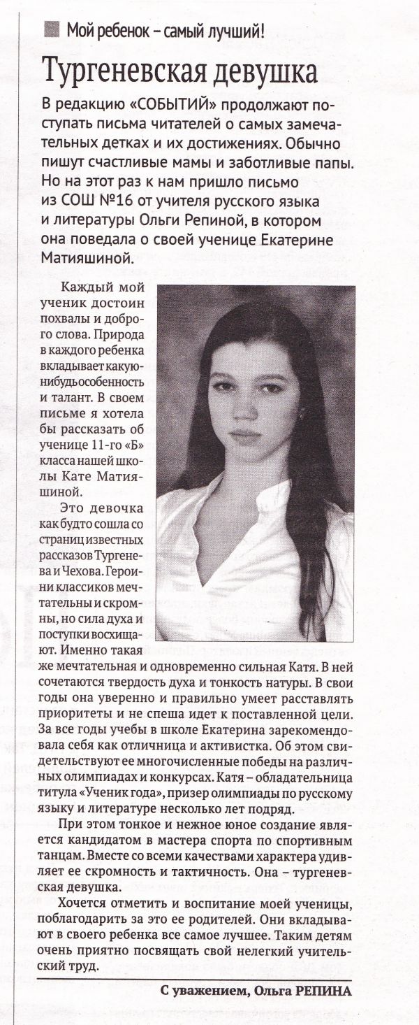 В газете "Взгляд на события" опубликована заметка "Тургеневская девушка" учителя русского языка и литературы Ольги Арликиновны Репиной. Заметка вышла в рубрике "Мой ребенок…