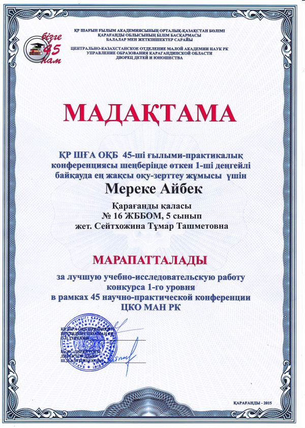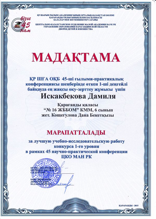 За лучшую учебно-исследовательского работы конкурса 1-го уровня в рамках 45 научно-практической конференции ЦКО МАН РК награждаются ученица 6 класса Искакбекова Дамиля, руководитель Кощегулова…