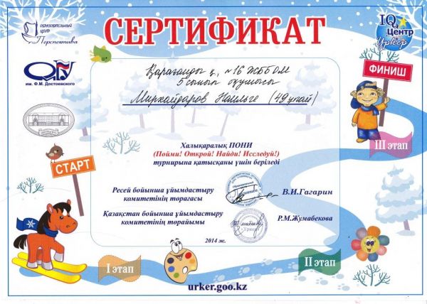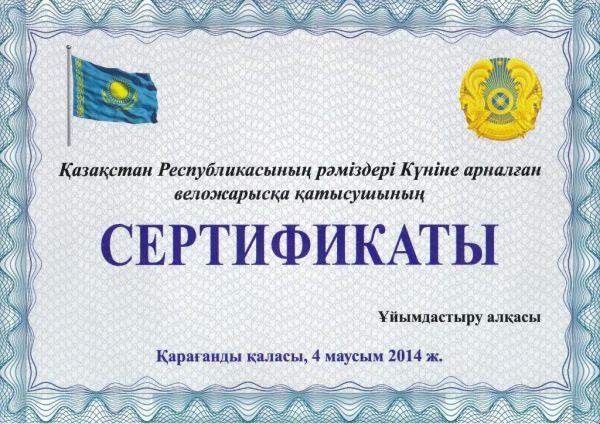 Сертификат за участие в велогонке, посвященной дню Государственных символов Республики Казахстан