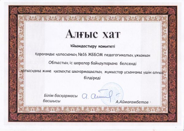 Благодарственное письмо педагогическому коллективу СОШ №16