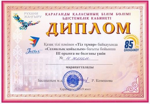 19.03.2019 ж мектебіміздің 4Б сынып оқушылары қазақ тілінен "Тіл тұмар" байқауында "Сахналық қойылым" бағыты бойынша ІІІ орынға ие болды. Жетекшілері қазақ тілі пәні мұғалі…
