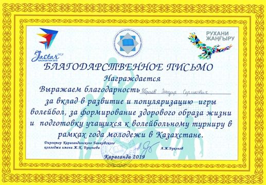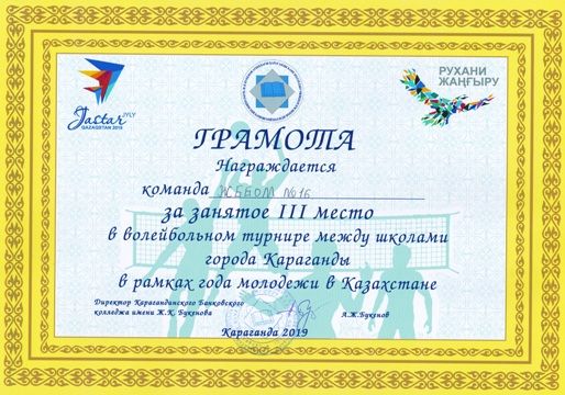 Грамотой награждён команда КГУ СОШ №16 за занятое ІІІ место в волейбольном турнире между школами города Караганды в рамках года молодежи в Казахстане.  Учитель физической культуры Ибраев Э.С.