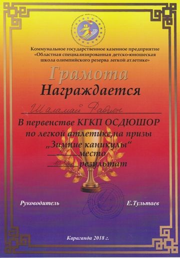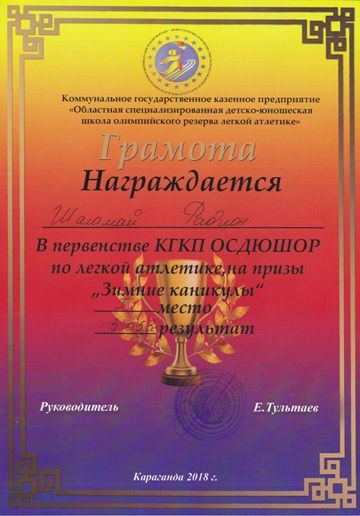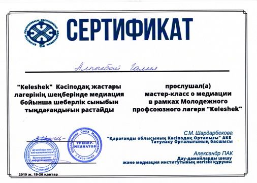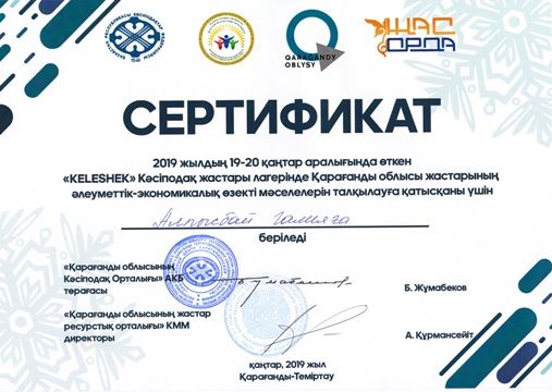 2019 жылдың 19-20 қаңтар аралығында өткен "KELESHEK" Кәсіподақ жастары лагерінде Қарағанды облысы жастарының әлеуметтік-экономикалық өзекті мәселелерін талқылауға қатысқаны үшін мектеп тәл…