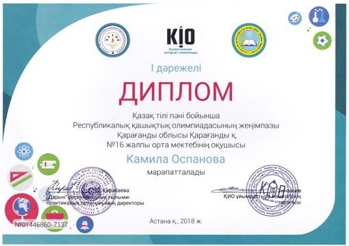 Қазақ тілі пәні бойынша Республикалық қашықтық олимпиадасының жеңімпаздары жүлделі орындарға ие болды. І орын  Козарев Станислав  11А сынып Еркінқызы Шырын   6А сынып Осп…