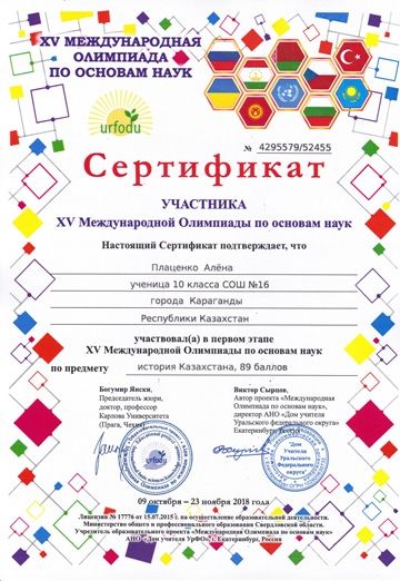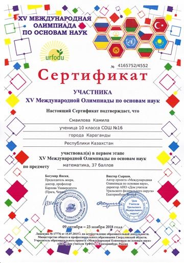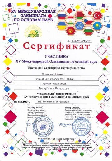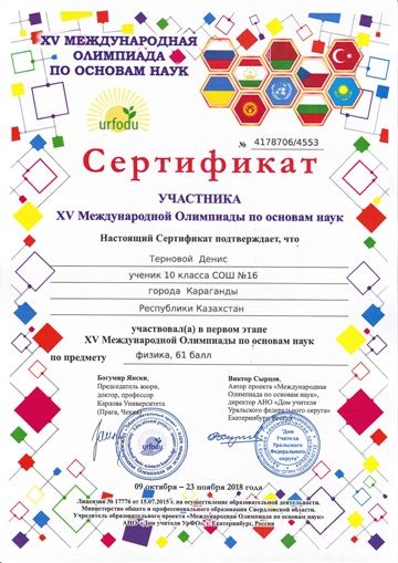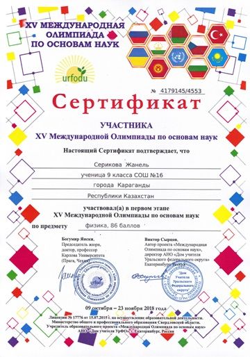 Поздравляем с сертификатами участников XV международной олимпиады по основам наук. 8-10 классы.