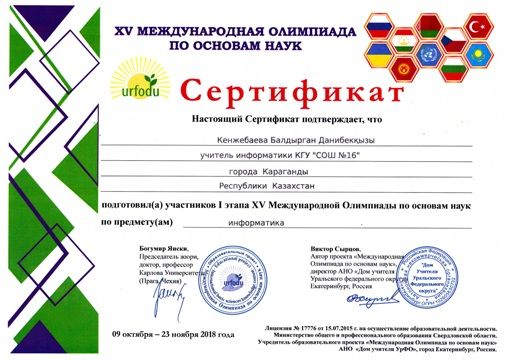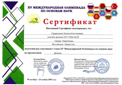 ХV международной олимпиады по основам наук сертификатами награждены учителя школы.
