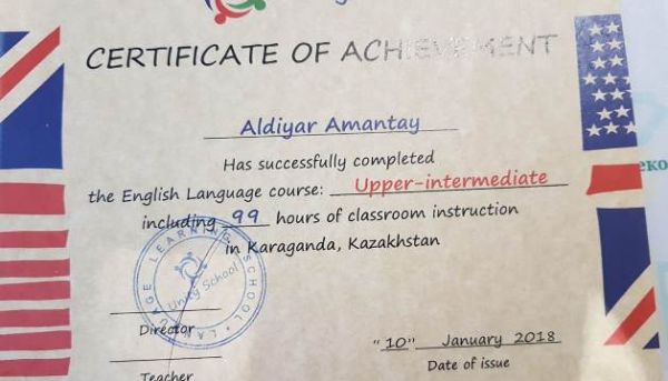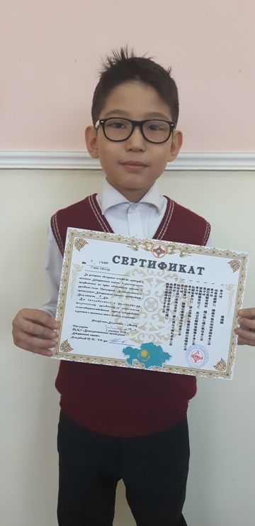 Ученик 3В класса Серік Айтуар награждён сертификатом за успешное овладение основами методов и техники Кёкушинкай каратэ.