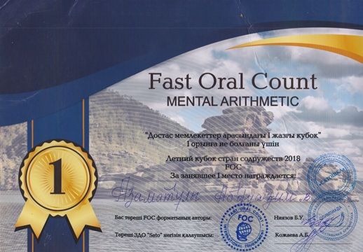 "Достас мемлекеттер арасындағы І жазғы кубок" менталды арифметикадан І орынға ие болғаны үшін 4Ә сынып оқушысы Азаматұлы Абдулазим марапатталды.