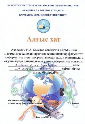 Академик Е.А.Бөкетов атындағы ҚарМУ-нің математика және ақпараттық технологиялар факультетінің ұйымдастырумен өткен информатика мен программалаудан ашық олимпиадаға қатысып, дипломмен, м…