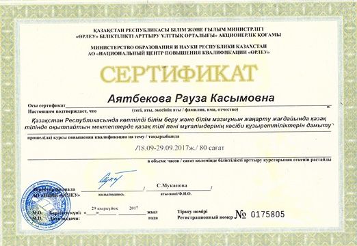 Қазақ тілі мен әдебиеті пәні мұғалімдеріне арналған біліктілікті артты курсынан өткен қазақ тілі мен әдебиеті пәні мұғалімдері С.Г.Нурфазыловаға, Р.К.Аятбековаға сертификат берілді. Сондай-ақ өзінің…