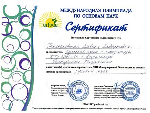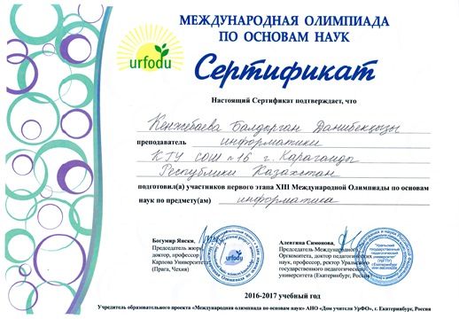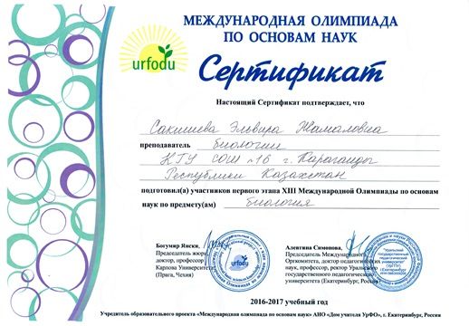 Сертификатом награждается учителя СОШ №16 за подготовку участников первого этапа ХІІІ Международной Олимпиады по основам наук.